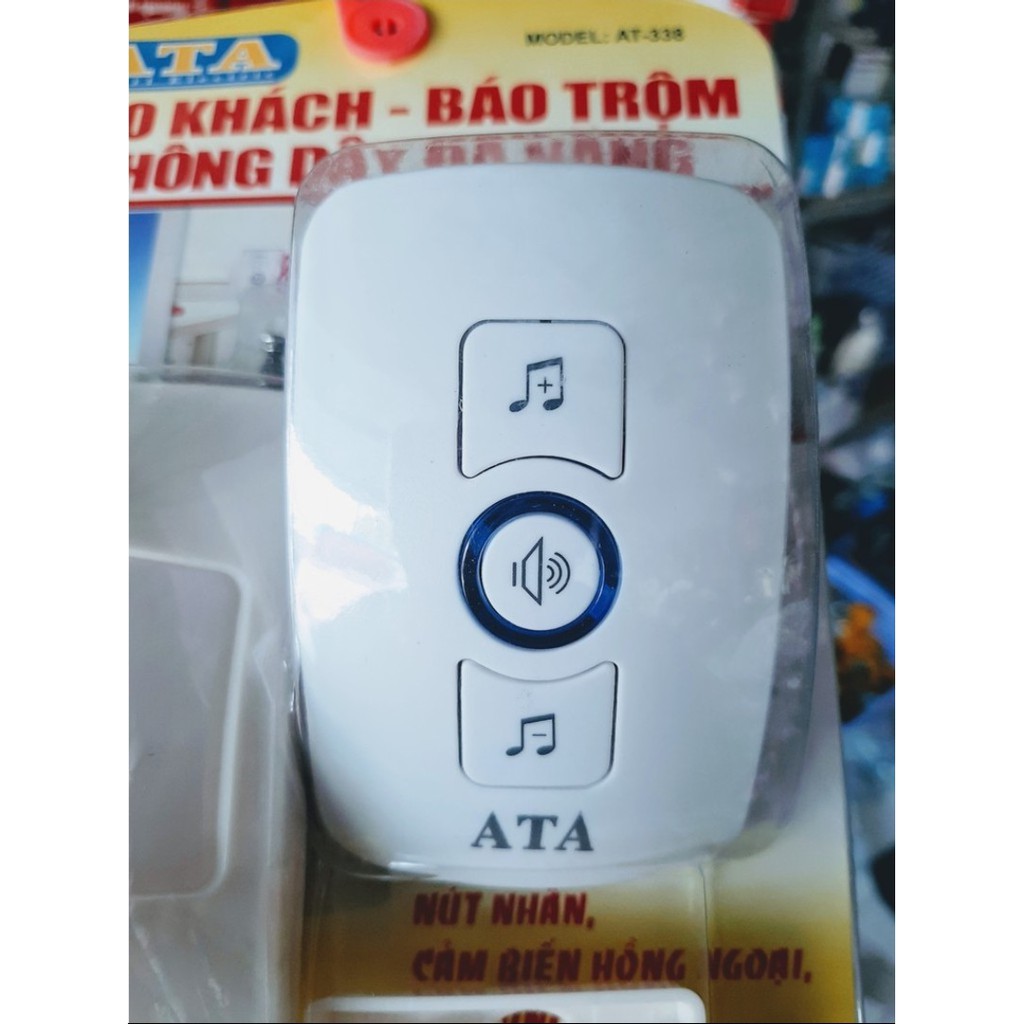 Mô tả sản phẩm phẩm Báo khách báo trộm không dây đa năng ATA AT338:- Sản phẩm dùng công nghệ cảm ứng hồng ngoại và kết nối không dây giữa đầu cảm ứng và chuông báo khách dùng sóng Radio, xuyên vật cản với độ nhạy cao, đầu cảm ứng dùng pin 9V và chuông cắm trực tiếp vào ổ điện 220V.Tiện lợi, dễ dàng sử dụng, tích hợp được với cảm biến từ gắn cửa, nút nhấn chuông, hoặc thêm nhiều chuông nhiều mắt cảm ứng hồng ngoại.