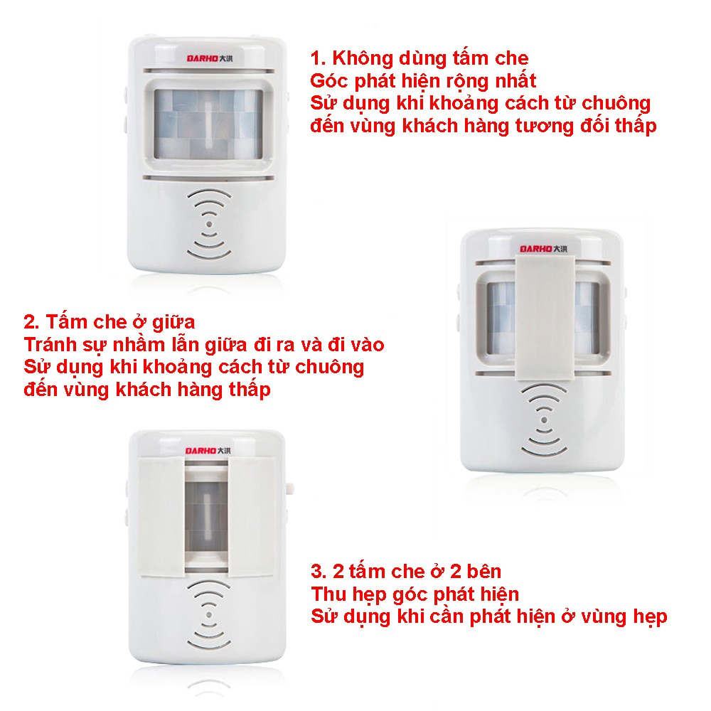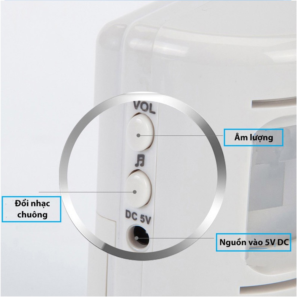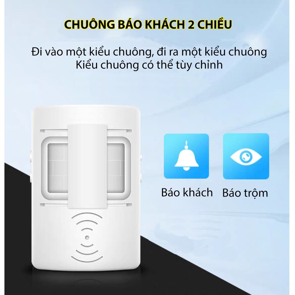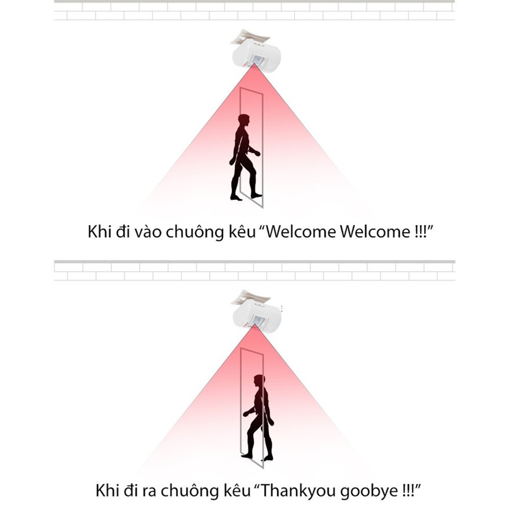 Chuông báo khách cảm biến hồng ngoại 2 chiều, báo trộm hiệu quảĐiều đặc biệt là thiết bị hỗ trợ cảm biến 2 chiều: chiều khách vào sẽ phát câu chào khách, chiều khách ra sẽ phát câu tạm biệt khách