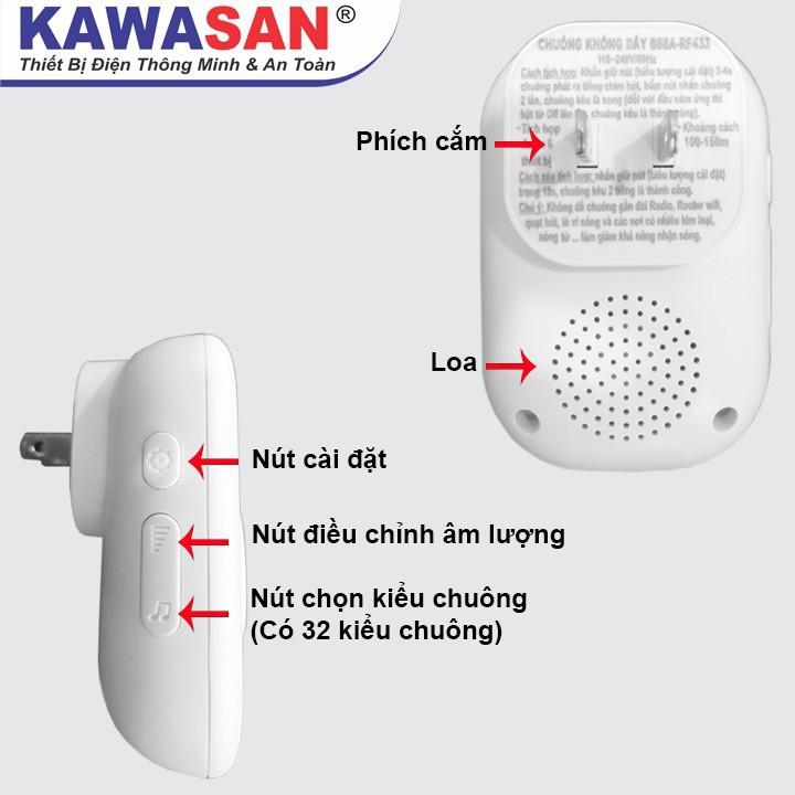 ** Để xóa tích hợp: Nhấn giữ nút chọn kiểu chuông đồng thời cắm chuông vào ổ điện, chờ khoảng 10 giây thả tay ra là thành công.