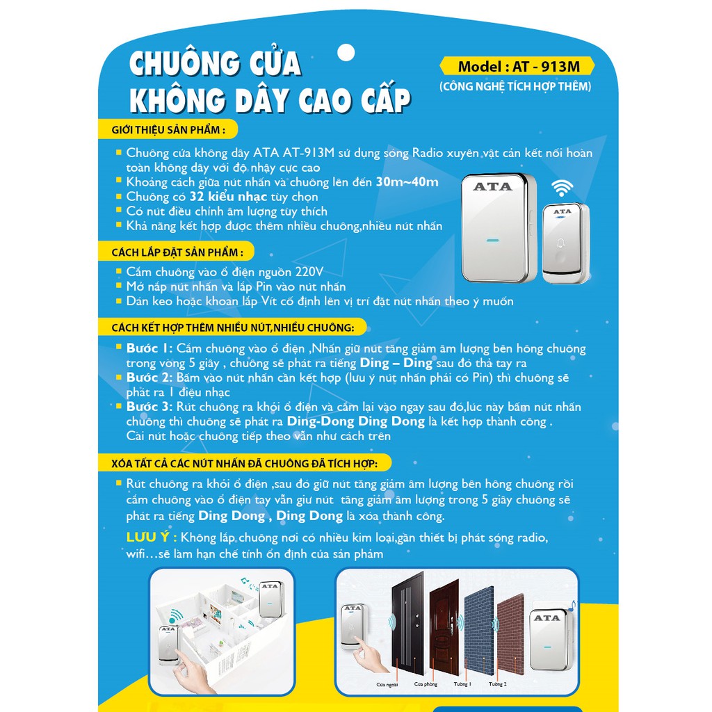 Giới thiệu Bộ chuông cửa - 3 nút nhấn không dây loại tốt ATA AT-913M - Tiếng chuông lớn