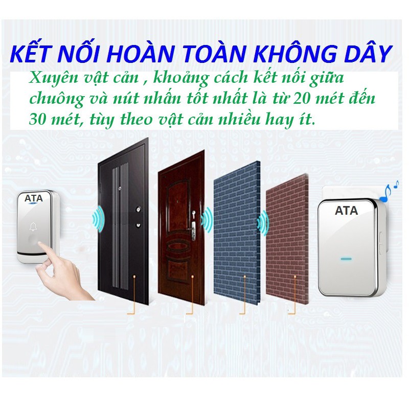 -Kết nối không dây, khoảng cách bắt sóng của chuông và nút nhấn từ 20 mét -30 mét, xuyên tường xuyên cửa kiếng.