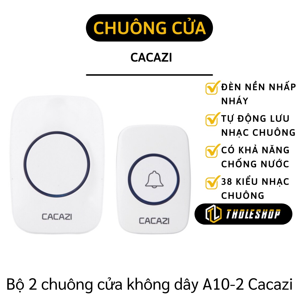 - Chuông cửa thông minh không dây Cacazi là phiên bản nâng cấp mới nhất của thương hiệu Cacazi có khoảng cách nhận tín hiệu cực rộng bán kính 300 mét trong điều kiện lý tưởng, có 38 kiểu chuông thay đổi tuỳ ý, 3 mức âm lượng.