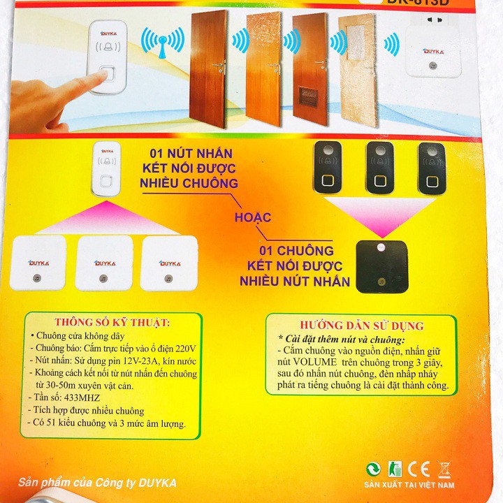 Chuông cửa không dây báo khách DK 813T được sản xuất tại Việt Nam, là loại chuông cửa không dây với nút nhấn được thiết kế chống nước, có 51 kiểu chuông và 3 mức âm lượng để lựa chọn.- ĐÔI KHI BẠN ĐÃ CHỌN ĐƯỢC NHẠC CHUÔNG ƯA THÍCH, NHƯNG DO MẤT ĐIỆN HOẶC RÚT CHUÔNG RA KHỎI Ổ CẮM, THÌ NHẠC CHUÔNG SẼ BỊ RESET VỀ BAN ĐẦU, NHIỀU NGƯỜI RẤT KHÓ CHỊU. VÀ ĐÂY LÀ SP LÀM RA ĐỂ ĐÁP ỨNG ĐÚNG NHU CẦU CỦA KHÁCH HÀNG, NHỚ NHẠC CHUÔNG CŨ KHI MẤT ĐIỆN HAY RÚT CHUÔNG KHỎI Ổ CẮM.