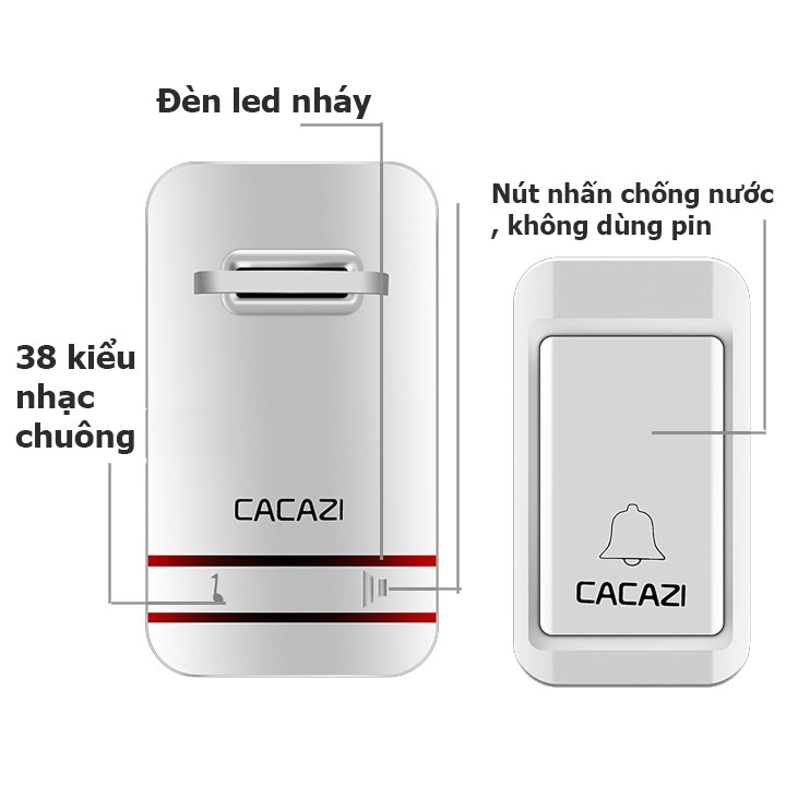 Chuông cửa không dây Cacazi không dùng pin chống nước, cực tốt, bảo hành 1 đổi 1 trong 1 tháng