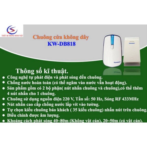 Thiết Bị Điện Gia Dụng > Mạch điện & Phụ tùng > Chuông cửa || Bộ chuông cửa không dây cao cấp 2 nút 1 chuông (không pin, không điện, siêu chống nước) Kawa DB818 (NEW)Còn hàng