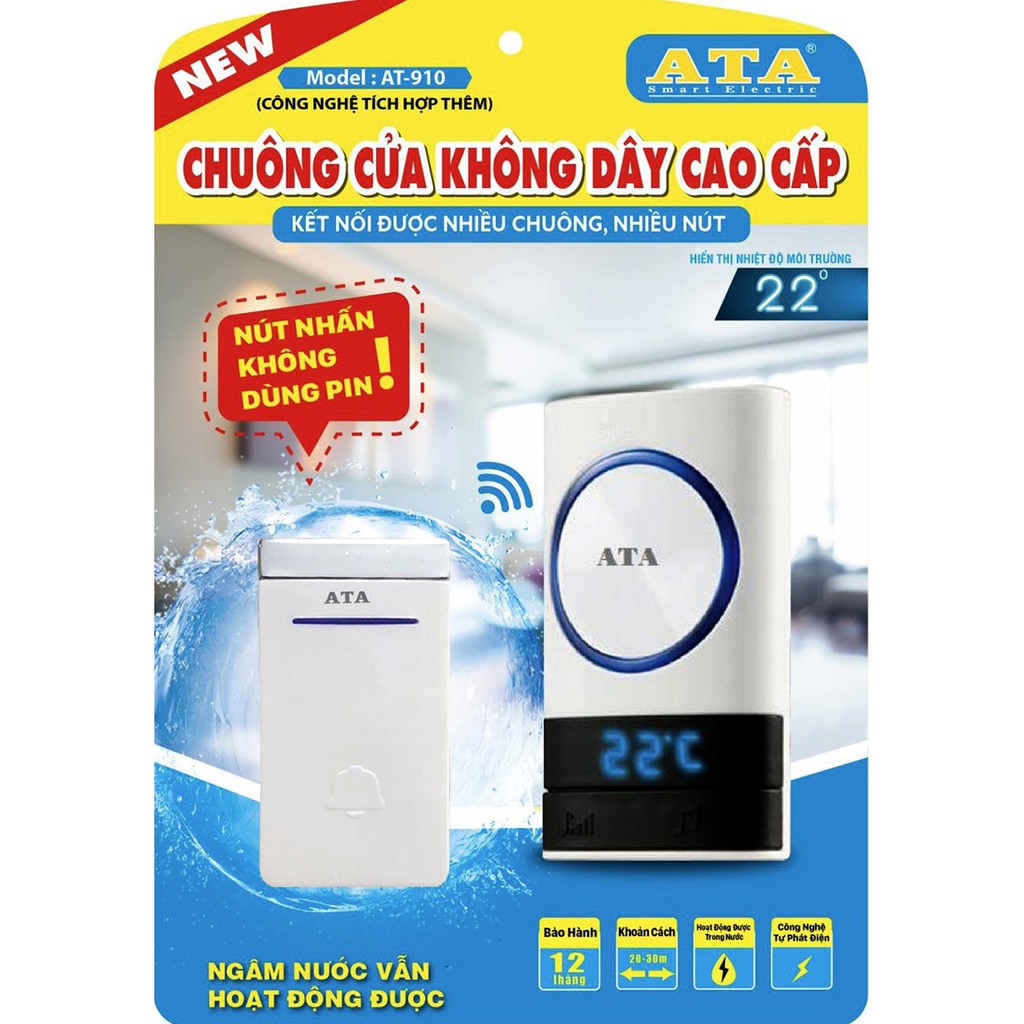 Chuông cửa không dây cao cấp ATA AT 910 nút nhấn không dùng pin hiển thị nhiệt độ chính hãng