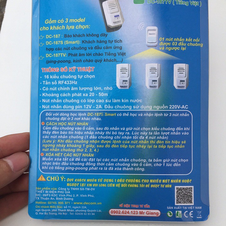 - Chuông cửa không dây DC187 là một thiết bị tiện lợi để báo có người về nhà, có khách đến nhà, lắp đặt và thay đổi vị trí thuận tiện, dễ dàng hơn rất nhiều so với loại chuông đi dây điện, có thể sử dụng để khách gọi phục vụ trong quán cà phê, nhà nghỉ, khách sạn, hay dùng cho bệnh nhân gọi y tá ..