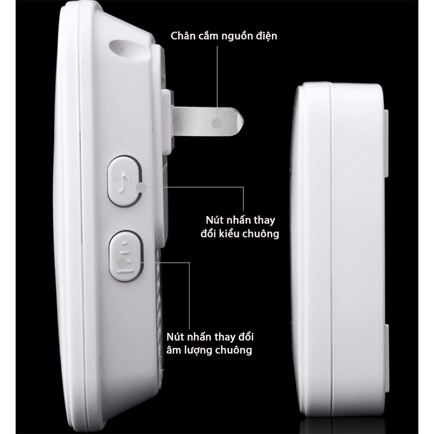 Chuông cắm trực tiếp vào ổ cắm 220v, Nút nhấn (thiết bị ngoài trời) sử dụng pin (có sẵn) dùng trong một năm hoặc lâu hơn.