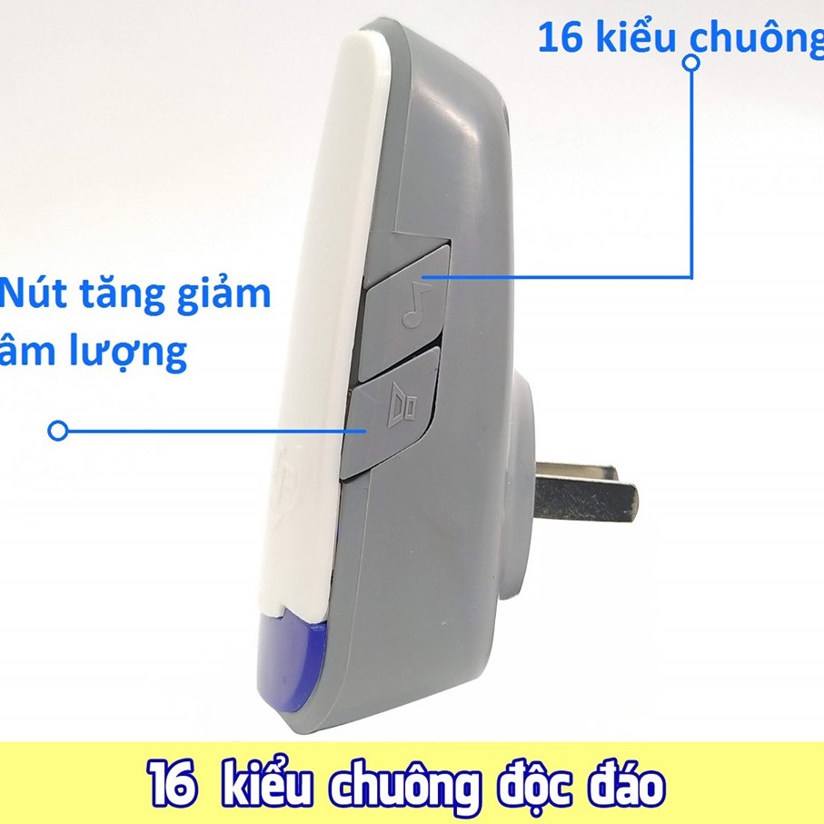- Chuông báo cắm vào ổ điện với nguồn điện 220V, có thể chỉnh 16 kiểu nhạc chuông và một kiểu báo động, 4 cấp độ điều chỉnh âm lượng chuông.