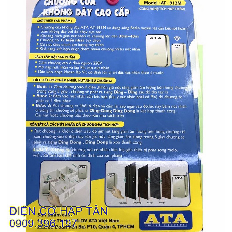CHUÔNG CỬA KHÔNG DÂY-ĐÔI -CAO CẤP - CHỐNG NƯỚC, XUYÊN VẬT CẢN 40-50M- CHÍNH HÃNG ATAChuông cửa đôi không dây cao cấp chống nước, xuyên vật cản 40-50m ATA AT-913A chuông đôi