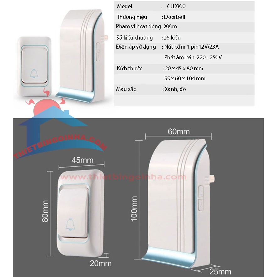 Chuông cửa không dây Doorbell CJD300 chất lượng cao – Một giải pháp tuyệt vời để thay thế chuông cửa có dây truyền thống. Tiện dụng, thiết kế đẹp; sản phẩm sẽ thay bạn chăm sóc ngôi nhà hay người thân của bạn…