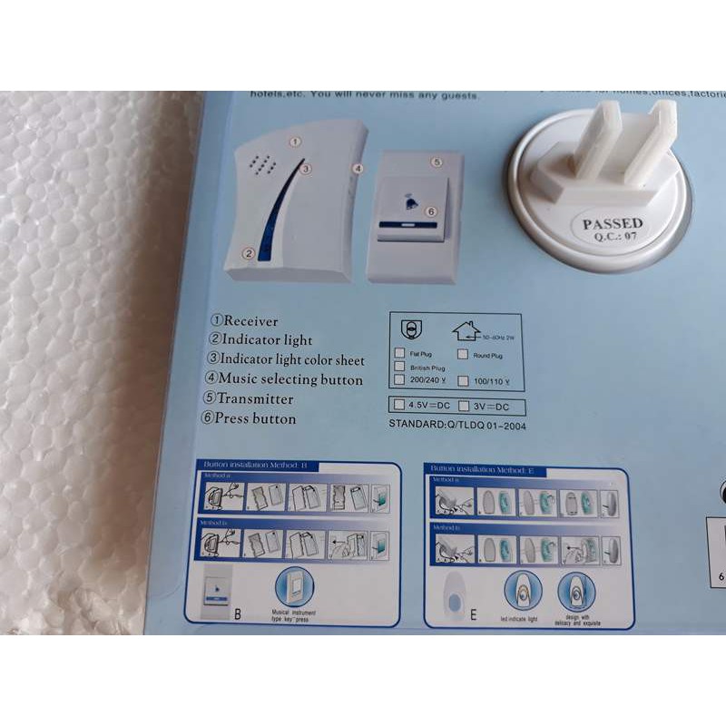 Một bộ chuông gồm : chuông cắm ổ điện ,nút nhấn có keo 2 mặt gắn cửa,1 viên PIN 23A 12V