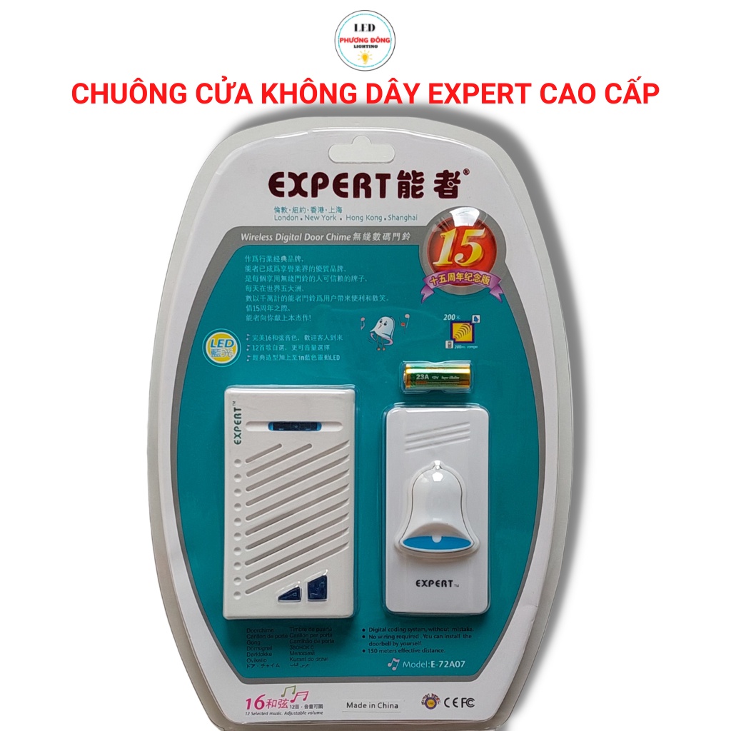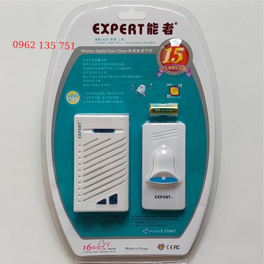 Bộ chuông cửa không dây Expert E-72A07- Đây là sản phẩm tiện ích cho gia đình. Có thể dùng bộ chuông không dây cho: Nhà riêng, hotel, văn phòng, nhà xưởng, người già yếu, người bệnh…