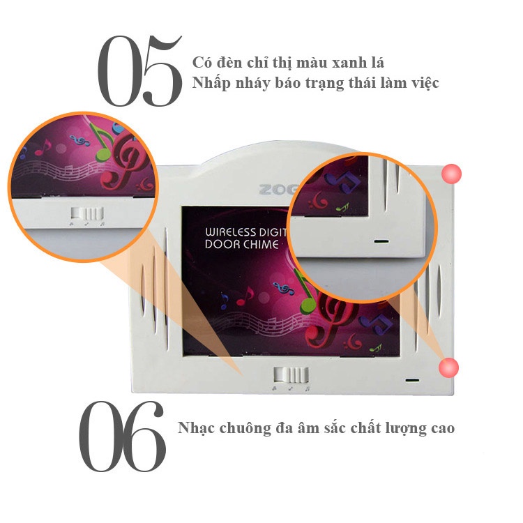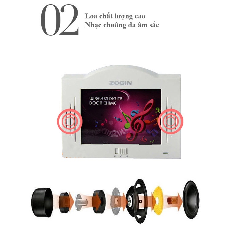 – Model: ZOGIN B04– Điện áp hoạt động của chuông (kiêm khung ảnh) : 3 pin tiểu AA (không kèm theo)