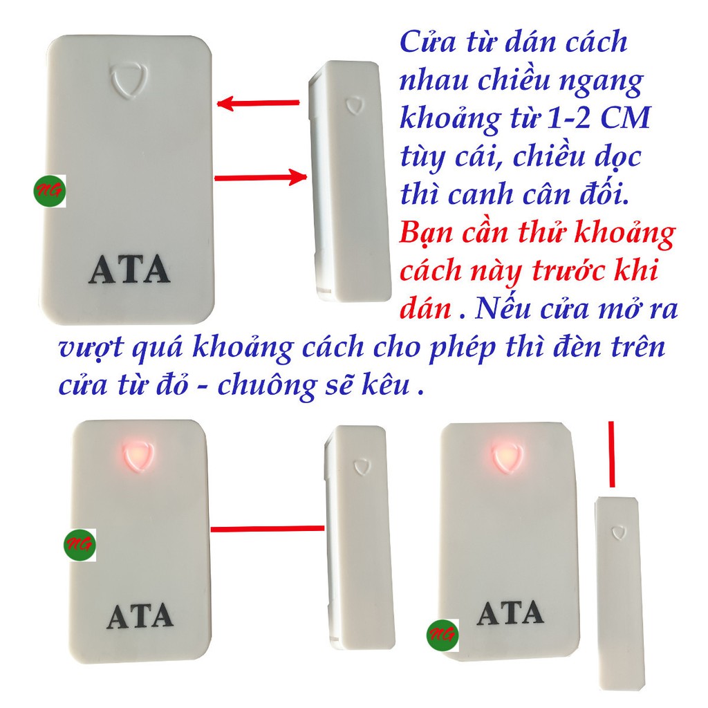 Cửa từ dùng pin 23A-12V ( hoặc có đợt dùng pin CR2032 3V ) dán vào 2 bên cửa cách nhau khoảng 0.5 - 1 cm ( khi cửa bị mở ra làm cho 2 cửa từ cách nhau trên khoảng cho phép thì chuông sẽ kêu)