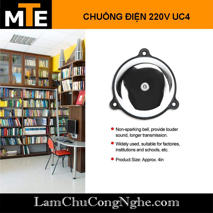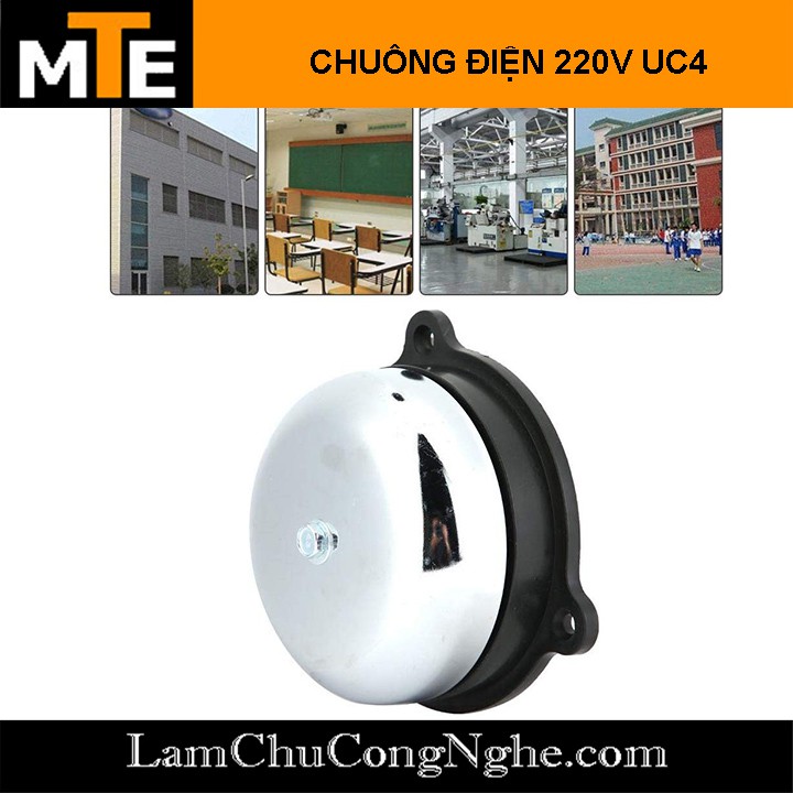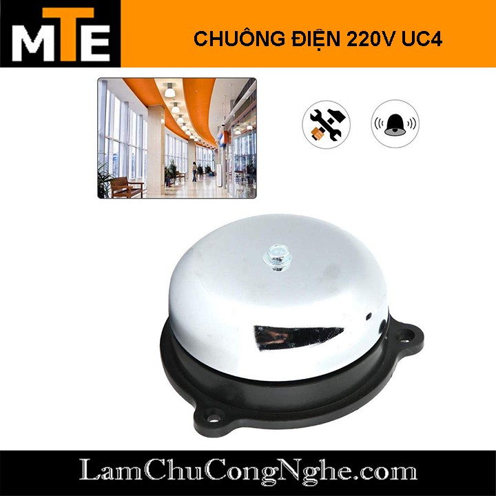 Chuông điện 220V được Thiết kế dạng cơ, siêu bền, Kêu Reng reng êm tai. Chuông sử dụng để báo thức:)), báo ra chơi, vào học trong trường học, báo cháy trong cửa hàng, khách sạn, nhà máy, những nơi công cộng,vv