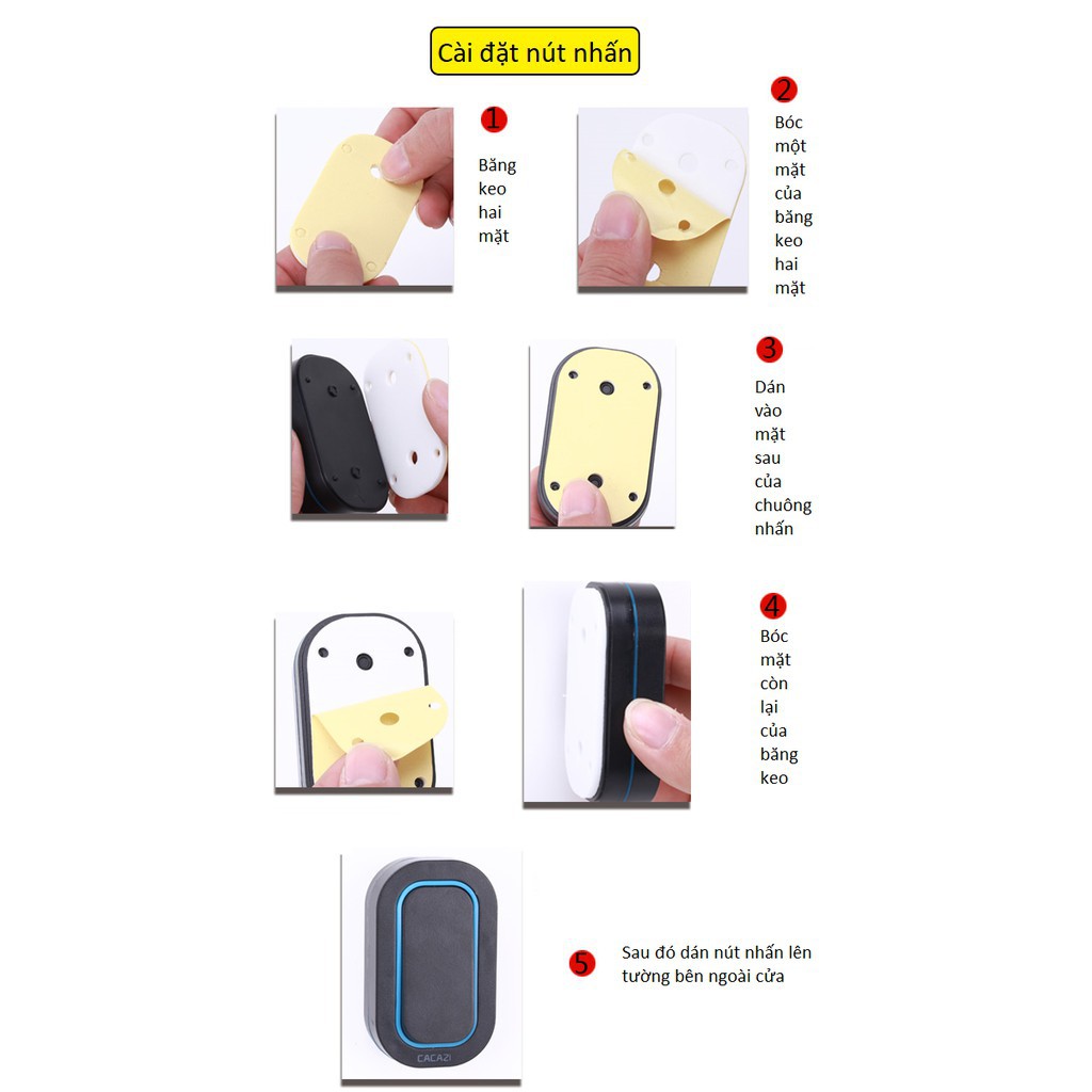 Chuông đôi không dây chống nước Cacazi Katjas 9909-2 lắp đặt vô cùng dễ dàng với chuông báo cắm điện trực tiếp và nút bấm có thể gắn lên cửa bằng băng keo hai mặt.