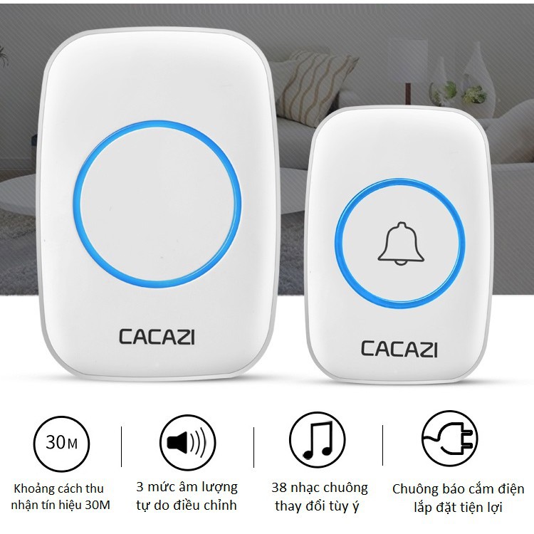 Chuông đôi không dây chống nước Cacazi A10 có 38 kiểu chuông khác nhau, 3 mức âm lượng với bộ sản phẩm có 02 nút nhấn và 01 chuông cửa rất thích hợp với thiết kế cho những ngôi nhà hiện đại ngày nay, góp phần tiện nghi cho ngôi nhà của bạn.THÔNG SỐ KỸ THUẬT: