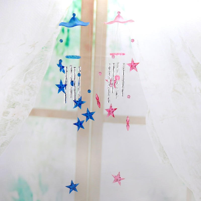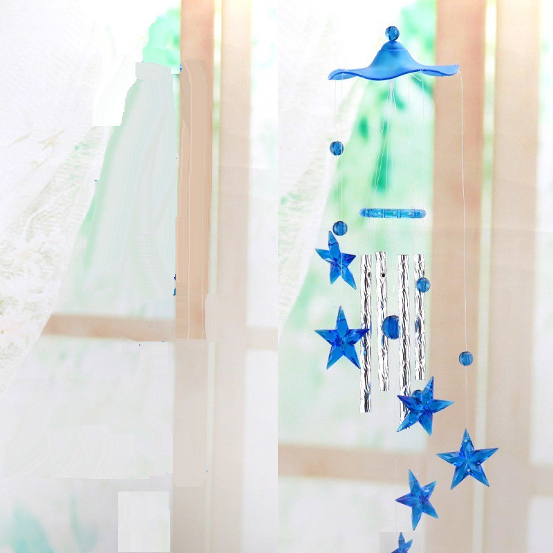 Chuông gió được thiết kế vô cùng tinh tế và dễ thương với hình ảnh ngôi sao xanh dương lung linh cùng 4 chiếc chuông thanh kim loại nhỏ xinh phát ra những âm thanh dễ chịu, một bản nhạc du dương, êm tai