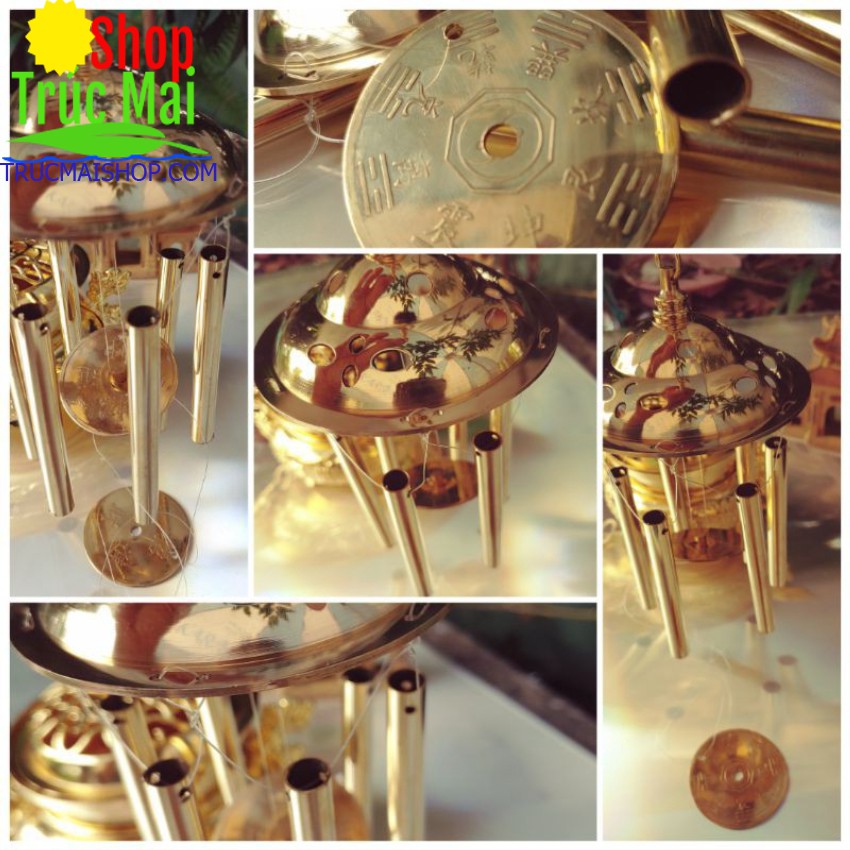 6 ống đồng vàng tạo tiếng chuông vang mỗi khi có cơn gió nhẹ thổi qua đồng vàng Tiên Thiên Bát Quái va vào tạo ra tiếng chuông phong thủy