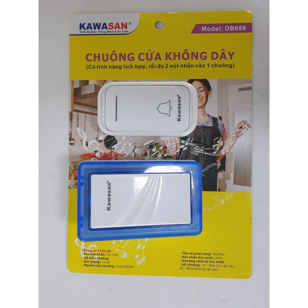 Thiết Bị Điện Gia Dụng > Mạch điện & Phụ tùng > Chuông cửa || Bộ chuông không dây KAWASAN Model: DB658 (tích hợp thêm chuông, thêm nút nhấn) - Điện gia dụng Hoàng KimCòn hàng