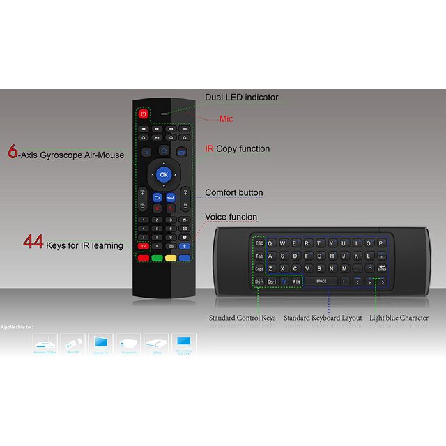 Chuột bay Air Mouse KM900 - Điều khiển bằng giọng nóiChiếc chuột bay KM900 thông minh, vừa chức năng chuột bay độc đáo, vừa đầy đủ bàn phím QWERTY ở mặt sau, vừa là chiếc điều khiển với đầy đủ chức năng cơ bản, đặc biệt nổi trội với khả năng học lệnh hồng ngoại của 44 phím để học lệnh từ các điều khiển.