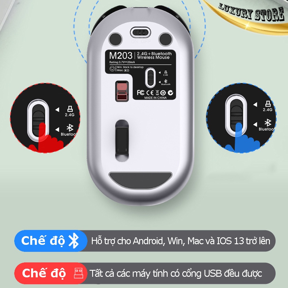 Chuột Bluetooth cho macbook Ipad Laptop M203 pin sạc vừa hỗ trợ kết nối qua USB wireless, vừa kết nối qua chế độ Bluetooth nên tương thích với hầu hết các thiết bị laptop, smartTV, máy tính PC, máy tính bảng, điện thoại (Có thể kết nối với cả Iphone, Ipad, điện thoại Android).
