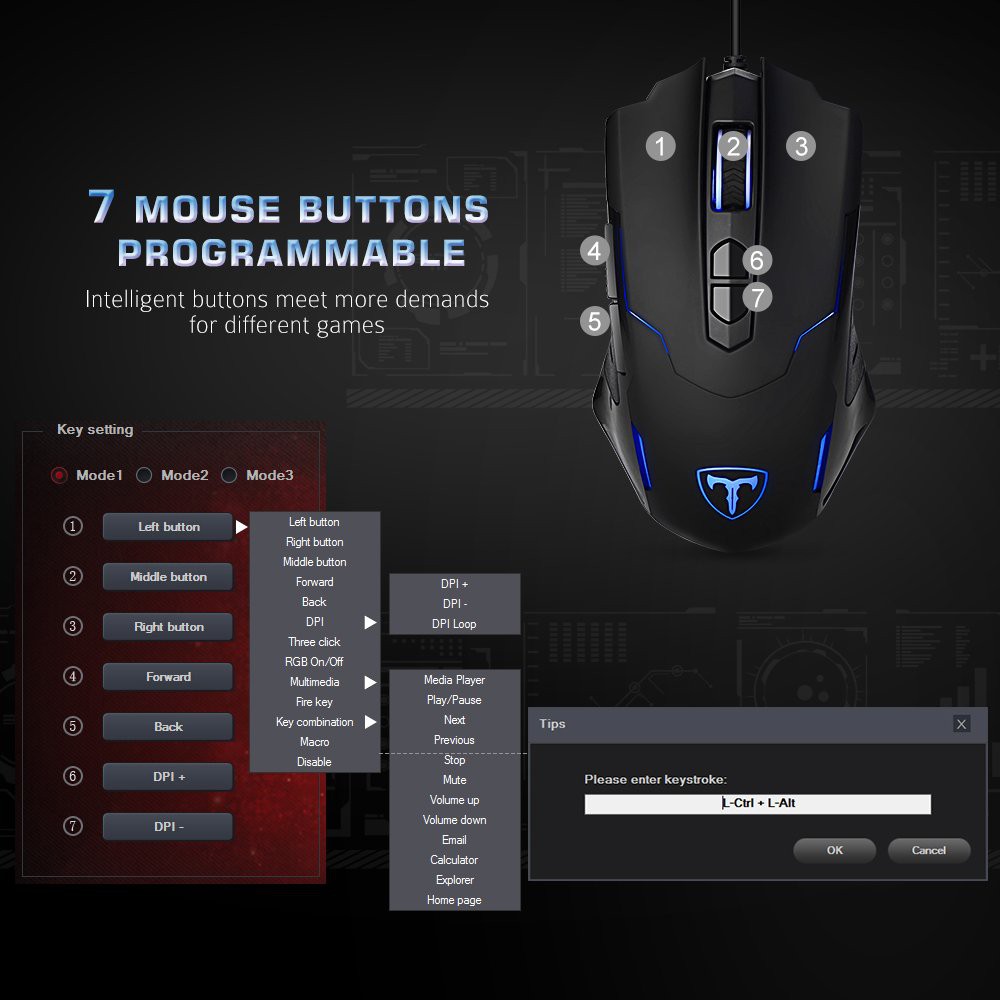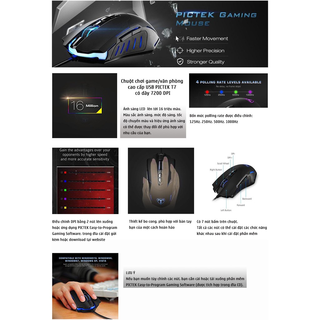 Giới thiệu Chuột chơi game USB PICTEK T7 có dây 7200 DPI 7 nút cho PC Laptop - Hãng Phân Phối chính thức
