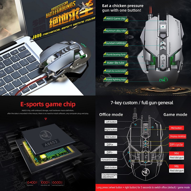 - Chuột cơ gaming led RGB 6400DPI - J800 mechanical Gaming mouse- Thiết kế công thái học , chống đau mỏi cổ tay khi dùng lâu