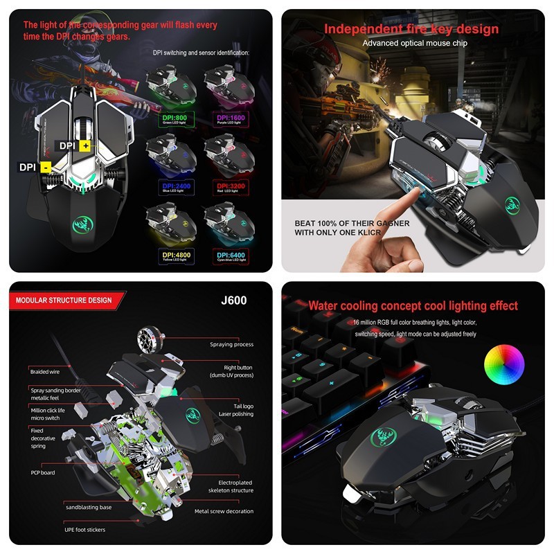 - Chuột cơ gaming led RGB 6400DPI - J600 mechanical Gaming mouse- Thiết kế công thái học , chống đau mỏi cổ tay khi dùng lâu