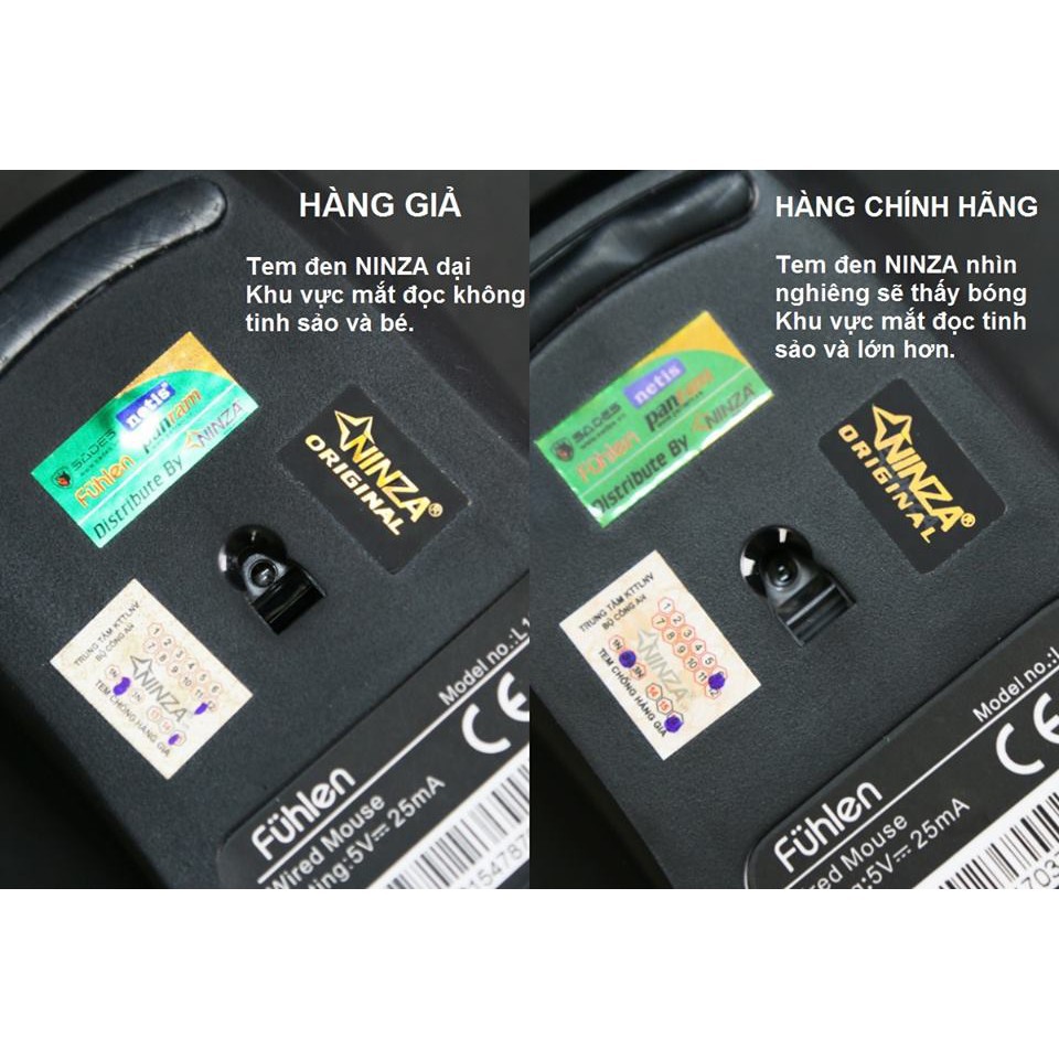 Chuột Fuhlen L102 bên shop bán là hàng chính hãng phân phối tại Việt Nam bởi công ty Ninza. Hàng chuẩn phải có tem chống giả do Bộ Công An cấp dán bên dưới thân chuột.Chuột Fuhlen L102 hiện giờ đã có hàng giả, nhái tên Fuhlen với giả rất rẻ, chỉ 30-50 nghìn nhưng chất lượng kém xa hàng xịn, dùng 1 tháng là hỏng, các bạn xem ảnh mô tả đi kèm sản phẩm bên trên để phân biệt hàng giả nhé.