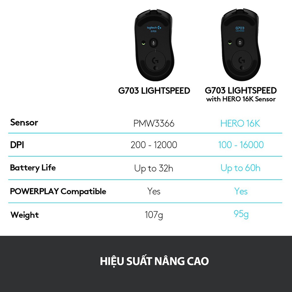 G703 LIGHTSPEED gia nhập dòng chuột có hiệu suất thế hệ tiếp theo với cảm biến HERO 16K tiên tiến. Sẵn sàng cho tính năng theo dõi cấp độ mới, công nghệ LIGHTSPEED được tăng cường và hiệu suất tiết kiệm năng lượng gấp 10 lần so với thế hệ trước. Thêm POWERPLAY để không còn phải lo lắng về việc sạc lại và giảm tải hoàn toàn cho LIGHTSPEED.