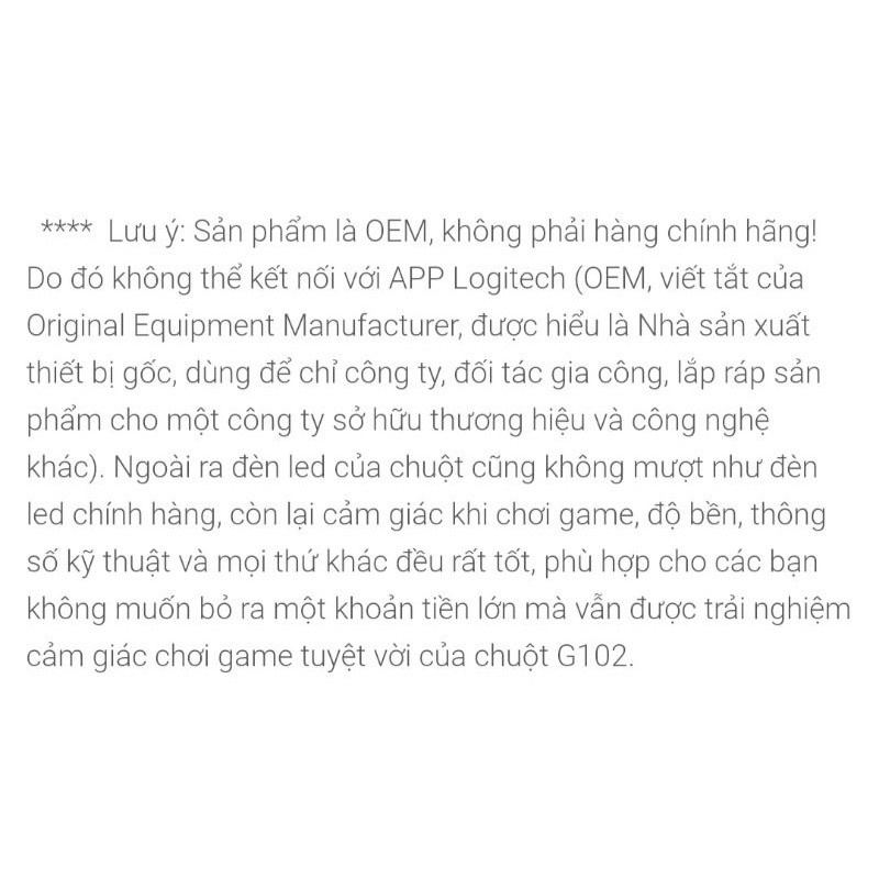 **** Lưu ý: Sản phẩm là OEM, không phải hàng chính hãng! Do đó không thể kết nối với APP Logitech (OEM, viết tắt của Original Equipment Manufacturer, được hiểu là Nhà sản xuất thiết bị gốc, dùng để chỉ công ty, đối tác gia công, lắp ráp sản phẩm cho một công ty sở hữu thương hiệu và công nghệ khác). Ngoài ra đèn led của chuột cũng không mượt như đèn led chính hàng, còn lại cảm giác khi chơi game, độ bền, thông số kỹ thuật và mọi thứ khác đều rất tốt, phù hợp cho các bạn không muốn bỏ ra một khoản tiền lớn mà vẫn được trải nghiệm cảm giác chơi game tuyệt vời của chuột G102.