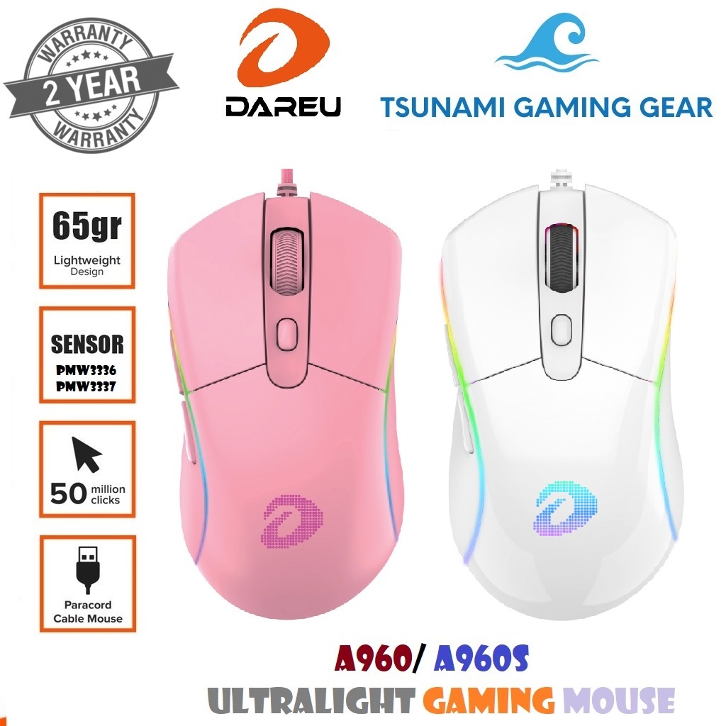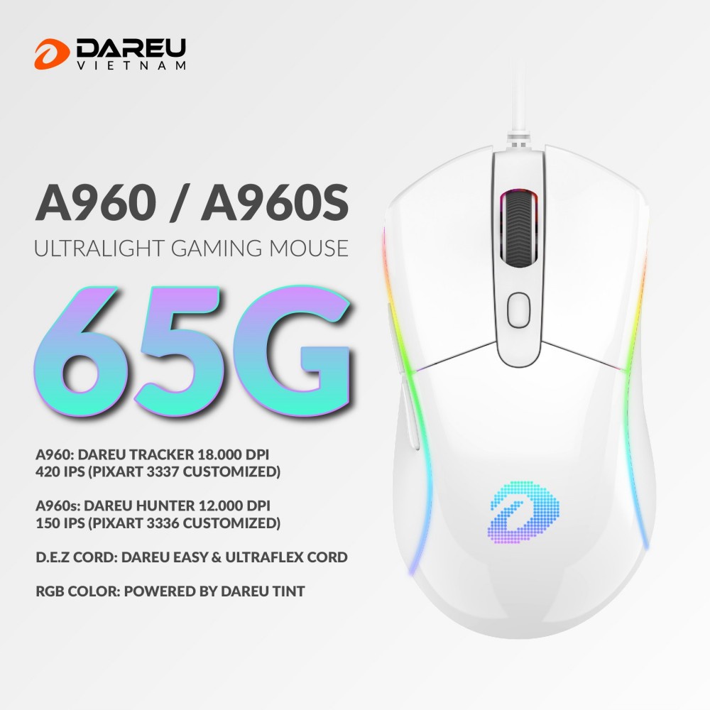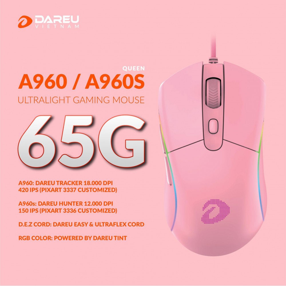 Giới thiệu Chuột Gaming DAREU A960s ULTRALIGHT QUEEN (Hồng)/ ARTIC (Trắng) RGB/ PWM3336 - PWM3337
