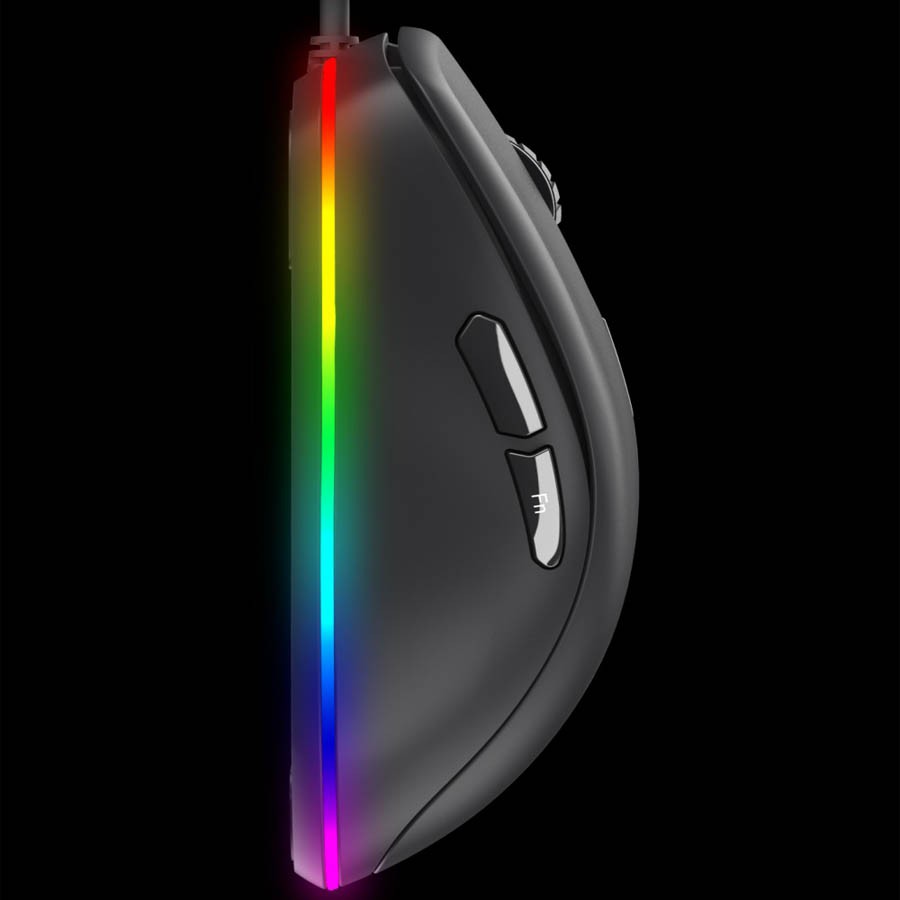 ► Ở giữa là con lăn với thiết kế hình bánh xe khá đẹp mắt, ngoài ra còn có nút điều chỉnh DPI ở dưới. 2 nút phụ được đặt ở bên hông và có vị trí rất thuận tay, khó bị bấm nhầm, đặc biệt ở nút Backward nhà sản xuất có in thêm chữ FN ( Function ), đây là phím chức năng dùng để điều chỉnh led của chuột theo tổ hợp phím bấm, rất tiện lợi, hướng dẫn chi tiết nhà sản xuất có in rất rõ ở mặt sau hộp sản phẩm.
