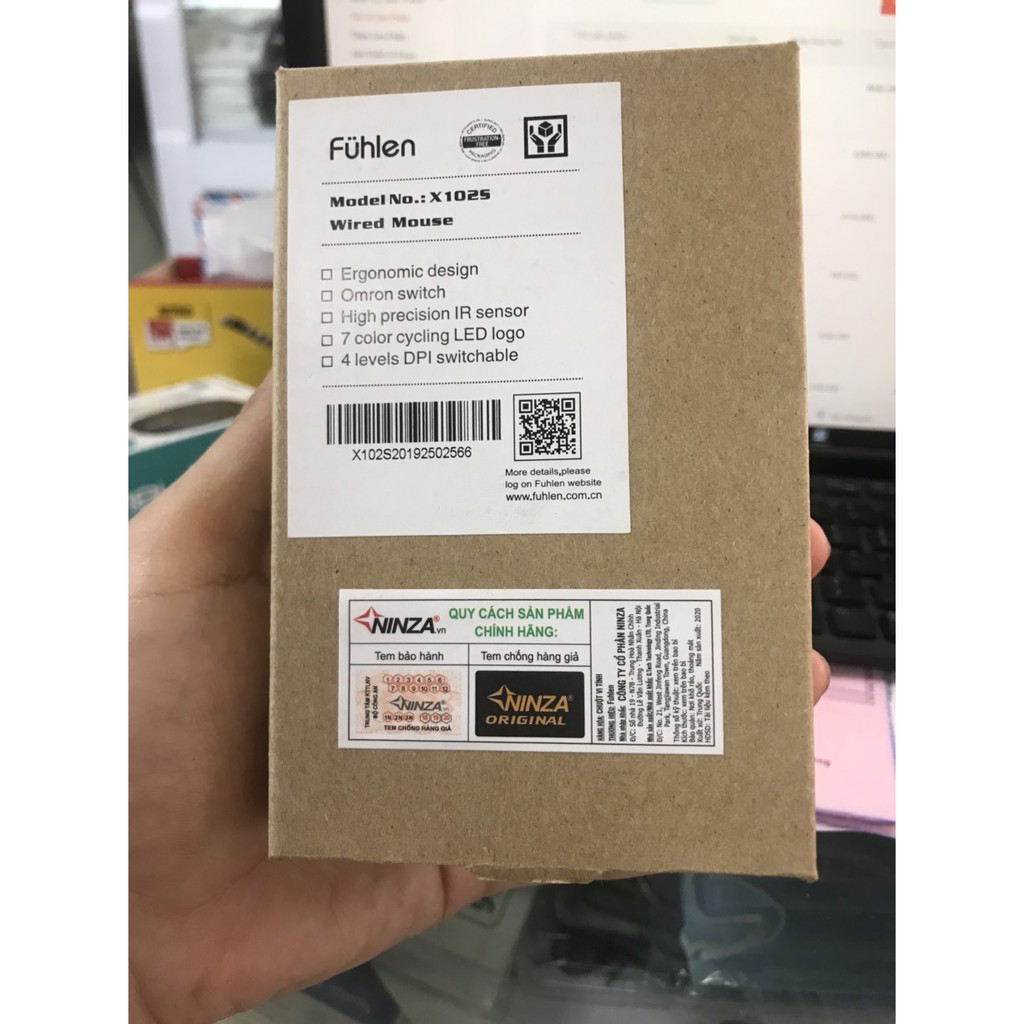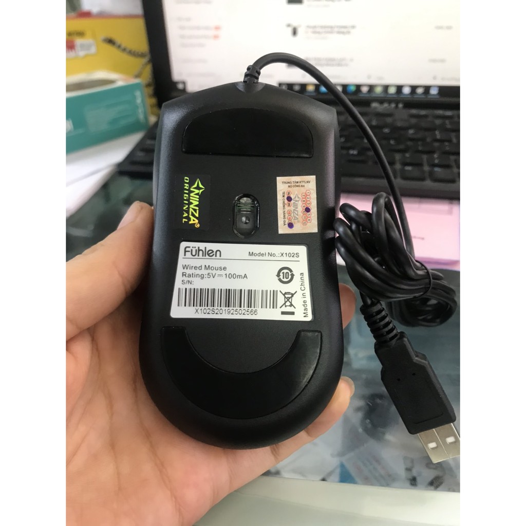 Chuột Fuhlen X102s chính hãng BH 2 năm, phân phối tại Việt Nam bởi công ty Ninza. Hàng chuẩn phải có tem chống giả do Bộ Công An cấp dán bên dưới thân chuột. Ngoài ra còn có tem bóng mờ của NinzaChuột Fuhlen X102s là sản phẩm thay thế hoàn hảo cho mẫu L102 đã trở nên huyền thoại đối với các quán Net lớn nhỏ ở Việt Nam.