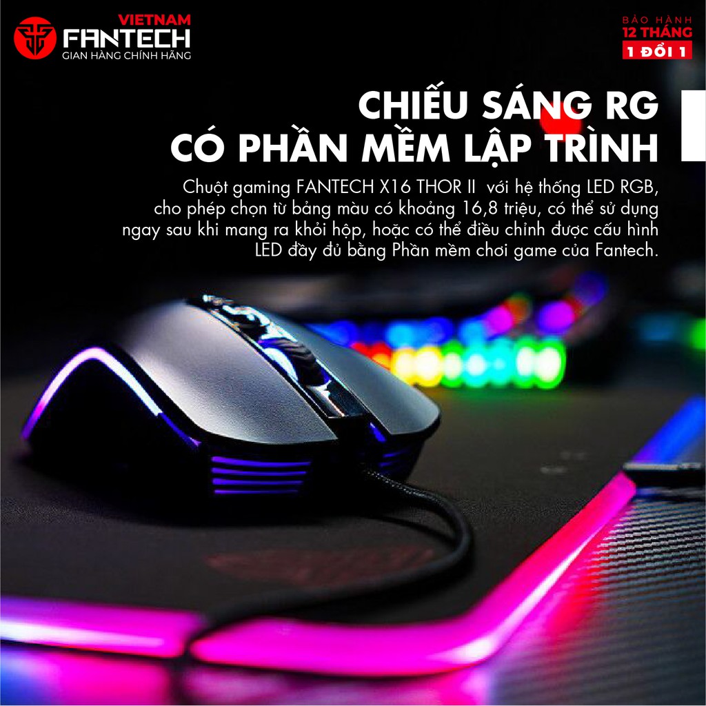 - Chuột gaming FANTECH X16 THOR II với hệ thống LED RGB, cho phép chọn từ bảng màu có khoảng 16,8 triệu, có thể sử dụng ngay sau khi mang ra khỏi hộp, hoặc có thể điều chỉnh được cấu hình LED đầy đủ bằng Phần mềm chơi game của Fantech.