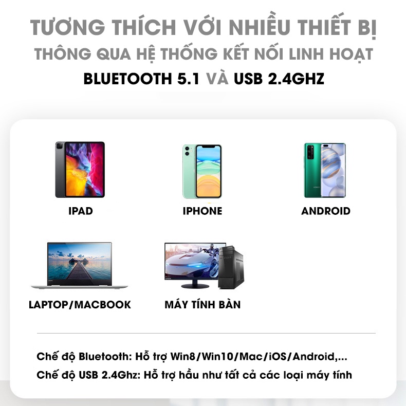 • Chế độ Bluetooth: Tương thích với Win8/Win10/Mac/iOS/Android,...