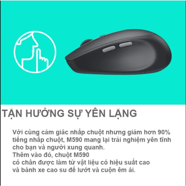 Suỵt… Chuột M590 Multi-Device Silent cho phép bạn hoàn thành nhiệm vụ một cách hiệu quả và không có tiếng ồn. Sử dụng Logitech FLOW, con chuột có khả năng kỳ diệu là điều hướng liền mạch trên hai máy tính và sao chép-dán từ máy này sang máy khác. Đặc điểm giảm 90% tiếng nhấp chuột đảm bảo bạn sẽ không làm phiền những người xung quanh.THÔNG SỐ KỸ THUẬT