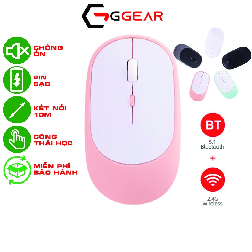 Ngoài hai loại chuột trên, Ggear còn cung cấp một loại chuột kết hợp hai kiểu kết nối, bluetooth + 2.4G, do đó rất đa năng. Vừa có thể dùng smartphone, macbook, ipad, … vừa có thể kết nối với laptop, pc, tv qua đầu thu USB 2.4G.