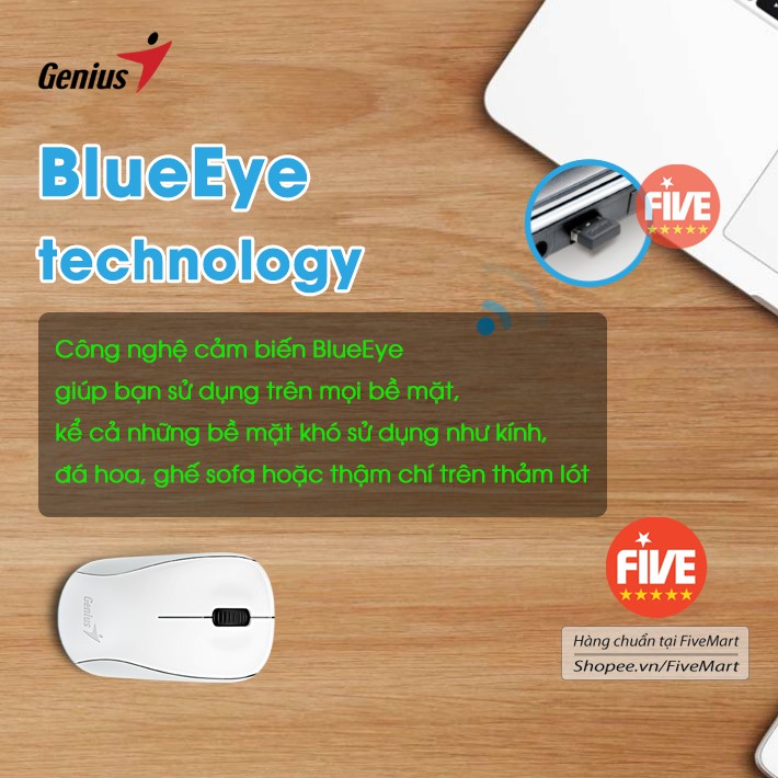 • Đặc biệt với công nghệ BlueEye - Công nghệ cảm biến hiện đại nên bạn có thể sử dụng chuột Genius NX7000 trên mọi bề mặt, kể cả những bề mặt khó sử dụng như kính, đá hoa, ghế sofa hoặc thậm chí trên thảm lót
