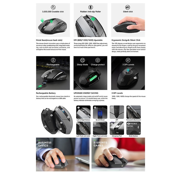 * Thiết kế tiện dụng: Chuột Bluetooth được thiết kế cho người dùng thuận tay phải để có cảm giác tay tốt nhất. Sáu nút hiệu quả và ba mức Dpi có thể điều chỉnh (1000/1200/1600) cho phép bạn tự do kiểm soát tốc độ chuột.