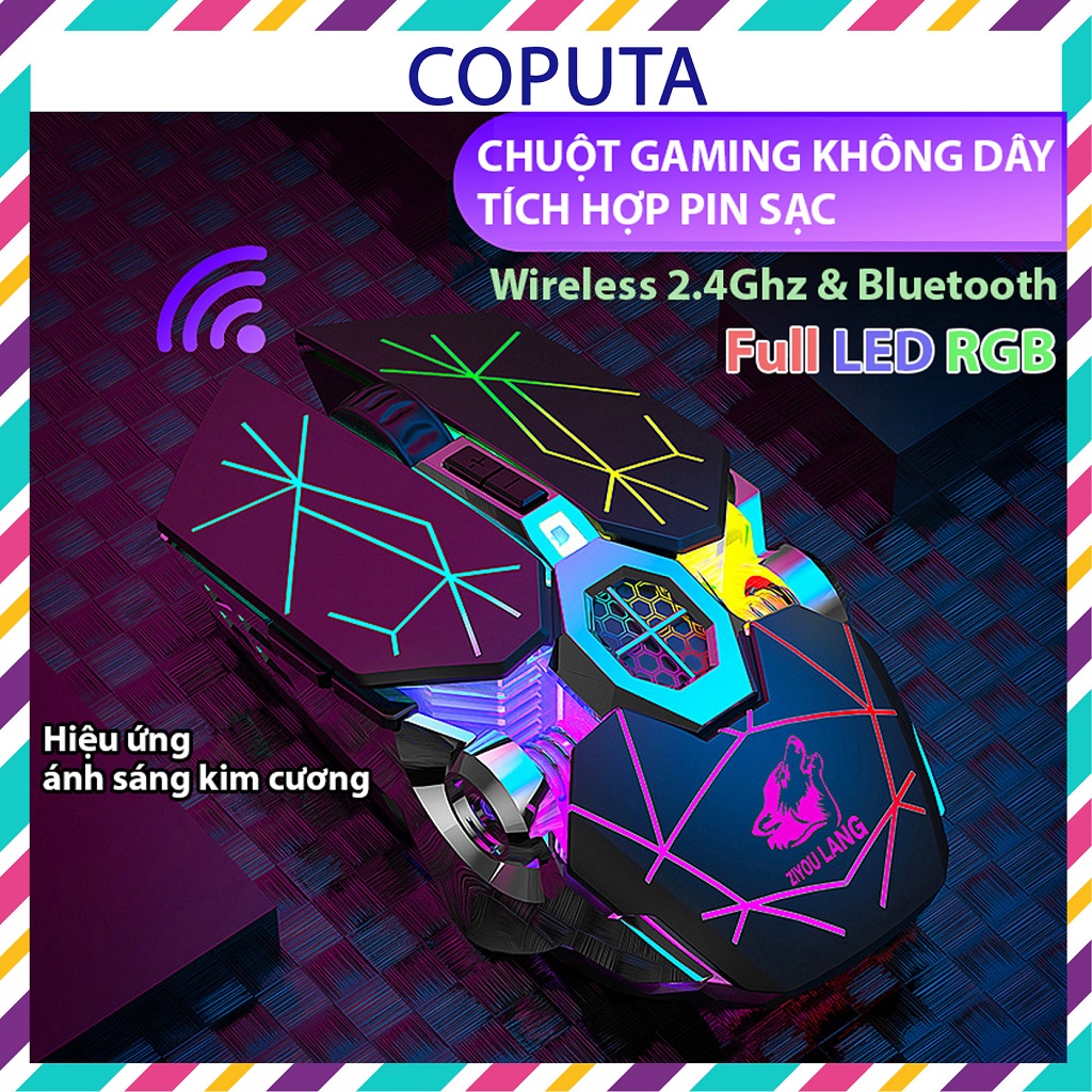 Chuột không dây Coputa chuột máy tính gaming Full LED RGB X13 thiết kế full LED kim cương, kieru dáng hiện đại, màu sắc sặc sỡ, đẹp mắt. Kết nối không dây 2.4hz và Bluetooth nhanh chóng và thuận tiện khi sử dụng.