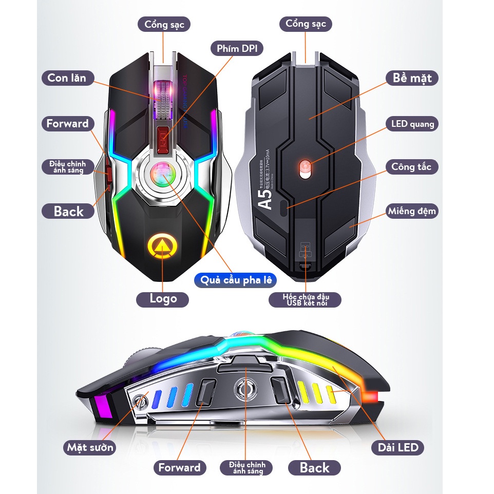 Chuột không dây Coputa chuột máy tính gaming laptop silent full LED A5Chuột không dây là một thiết bị ngoại vi của máy tính dùng để điều khiển và làm việc với máy tính, chuột không dây sử dụng sóng để kết nối không dây như bluetooth và NFC. Cấu tạo cơ bản của chuột không dây gồm: các nút bấm phải - trái, bánh xe lăn ở giữa để cuộn lên và xuống.