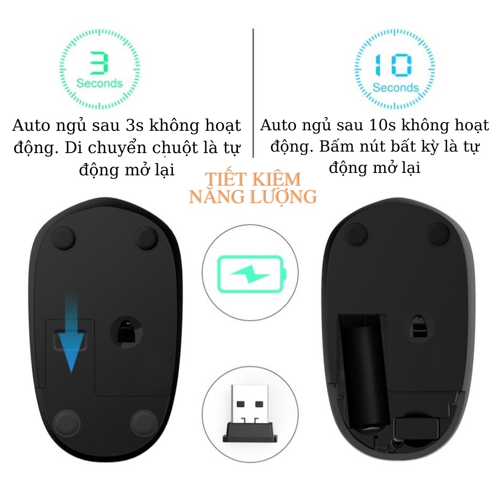 - Chuột không dây có chế độ tự động ngủ khi không hoạt động để tiết kiệm năng lượng và dễ dàng kích hoạt lại chỉ bằng cách di chuột hoặc bất nút bất kỳ trên thân chuột.