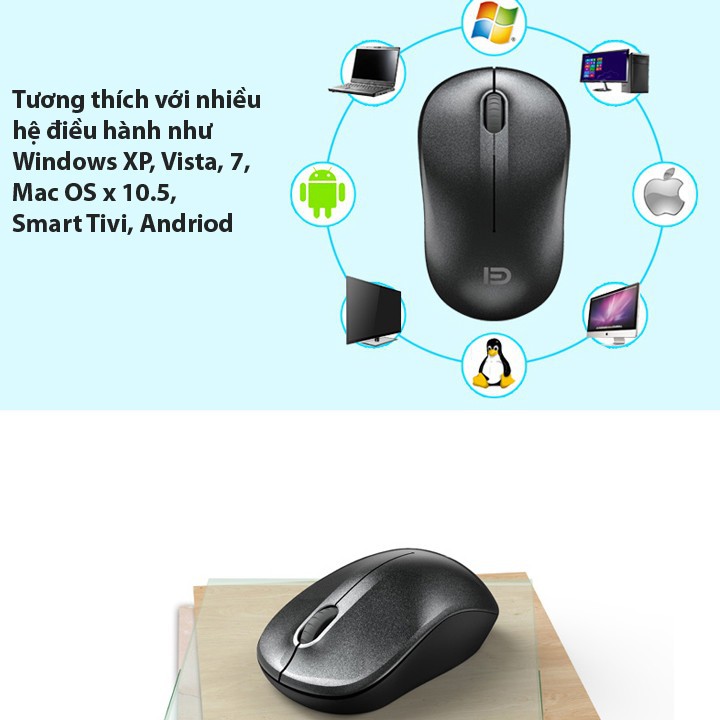 - Chuột không dây FD V102 tương thích với nhiều hệ điều hành như Windows XP, Vista, 7, Mac OS x 10.5, Linux Kernel 2.6.