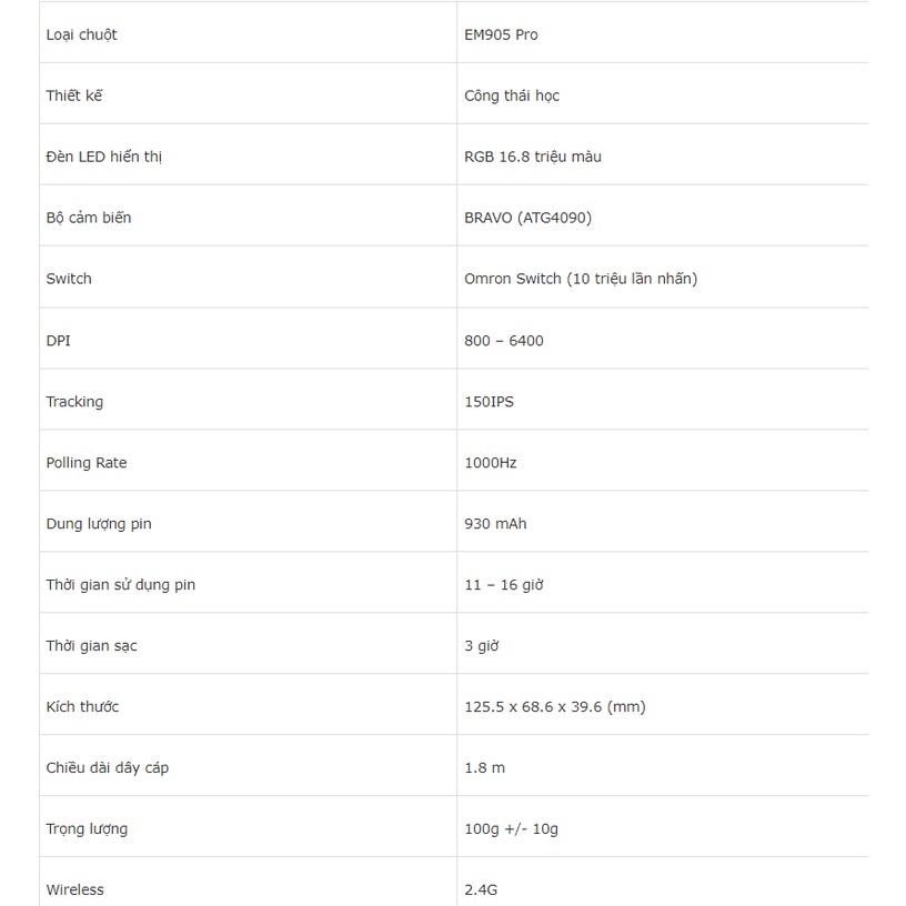 Thông số sản phẩm :* Chuột Không Dây Gaming DareU Em905 Pro WIRELESS - Like New BH 12 Tháng
