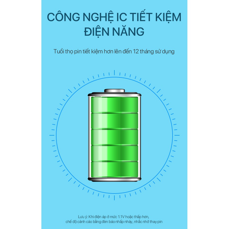 🟢 Công nghệ IC tiết kiệm điện năng (Lưu ý: Khi điện áp ở mức 1.1V hoặc thấp hơn, chế độ cảnh cáo bằng đèn báo nhấp nháy, nhắc nhở thay pin)
