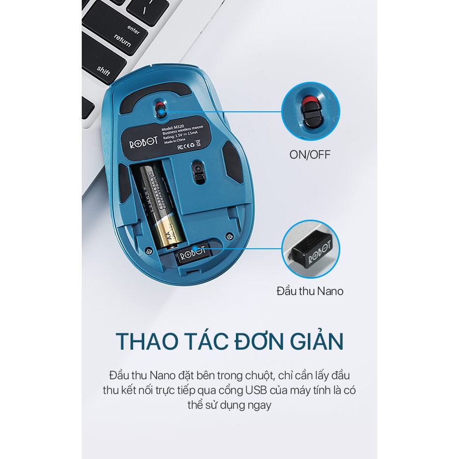 Máy tính & Laptop > Chuột & Bàn Phím > Chuột Máy Tính || Chuột Không Dây ROBOT M320 2.4GHz chuột tỉnh âm click không nghe tiếng khoảng cách tín hiệu 20m - Hàng Chính HãngCòn hàng