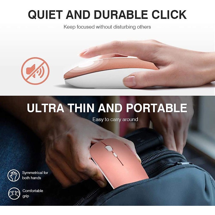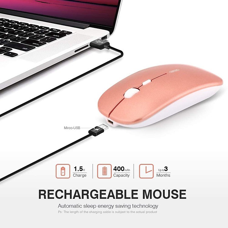 Thông số kỹ thuật:* Chuột không dây có thể sạc lại: Pin sạc chất lượng cao 500mAh tích hợp có nghĩa là bạn có thể sạc lại bất cứ khi nào bạn muốn. Khi bạn để chuột hơn 5 phút, nó sẽ tự động chuyển sang chế độ ngủ giúp tiết kiệm điện cho chuột và click vào bất kỳ nút nào để đánh thức chuột trở lại (Lưu ý: Vui lòng sạc lại trong 1 giờ cho lần đầu sử dụng). Một lần sạc đầy bạn có thể sử dụng được trong 1 tuần tùy theo mức độ sử dụng.